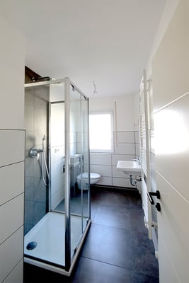 Neue Dusche mit modernen Sanitäreinrichtungen und Fußbodenheizung/Handtuchwärmer im Badezimmer